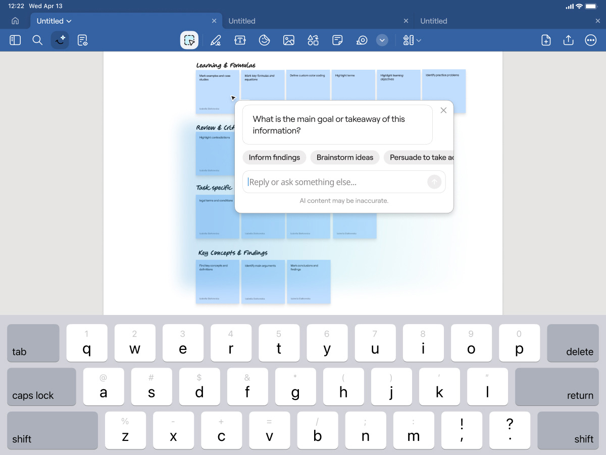 Goodnotes can automatically identify key themes and insights from your team's ideas, whether information is on stickies from a brainstorm, recorded audio from your meeting, or typed in a hurry — making it easy to prioritize and take action.