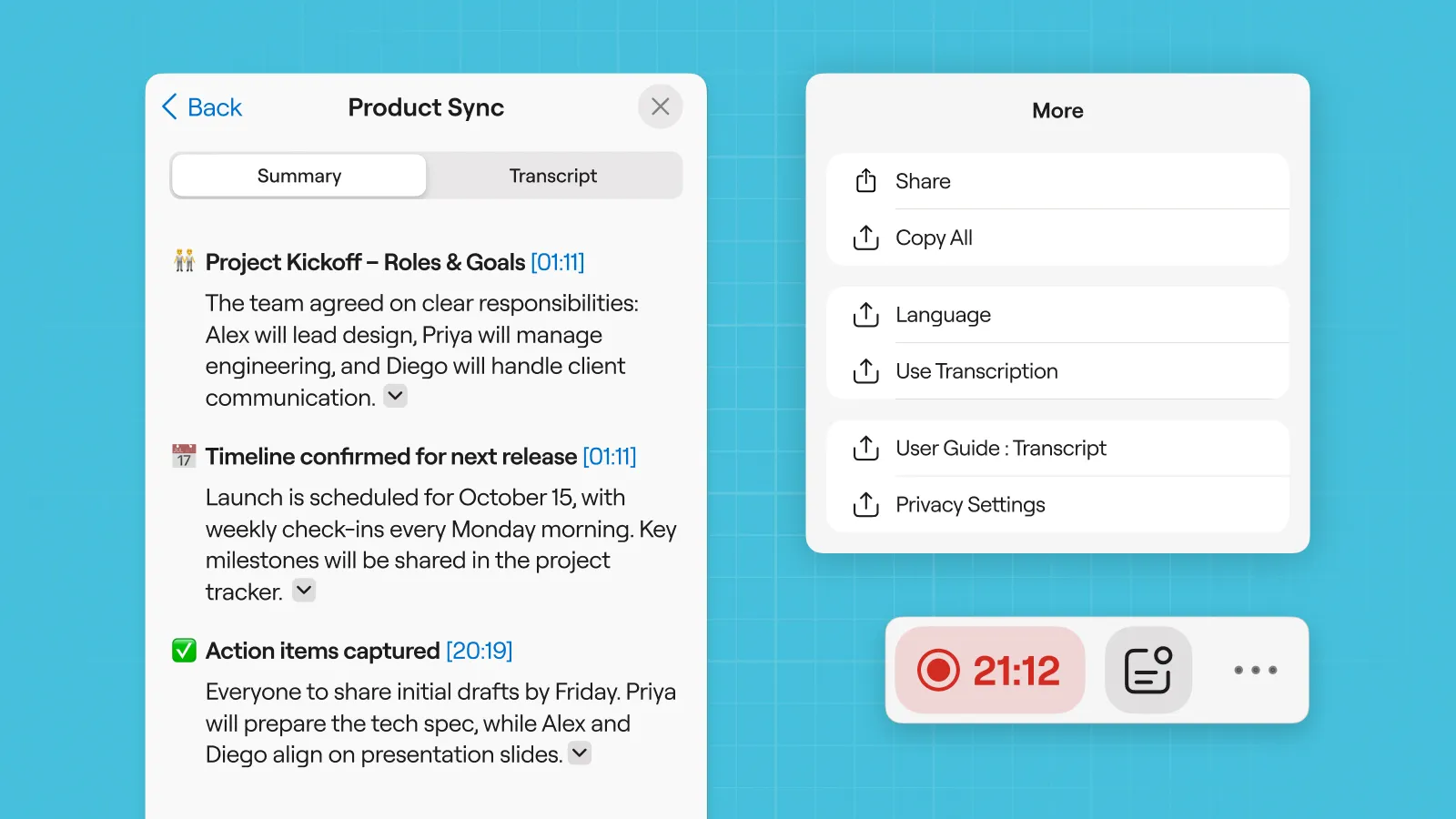 Sei in Besprechungen vollständig präsent – KI erstellt automatisch Notizen und fasst wichtige Punkte zusammen. So kannst du dich ganz auf das Gespräch konzentrieren.