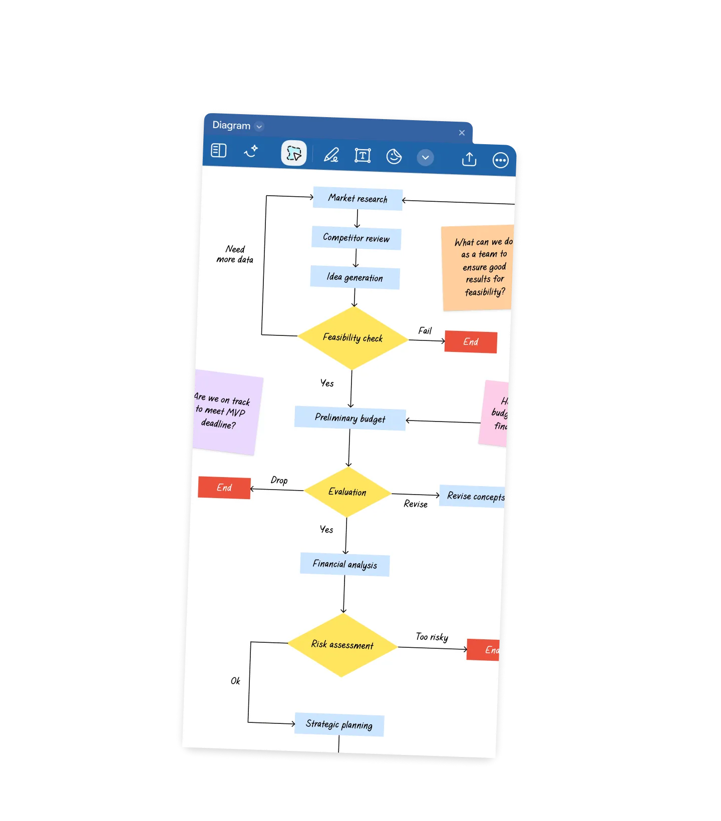Eine unendliche Leinwand für visuelles Denken. Erstelle umfangreiche Mindmaps, Flussdiagramme und visuelle Brainstorms mit grenzenlosem Raum für Ideen.