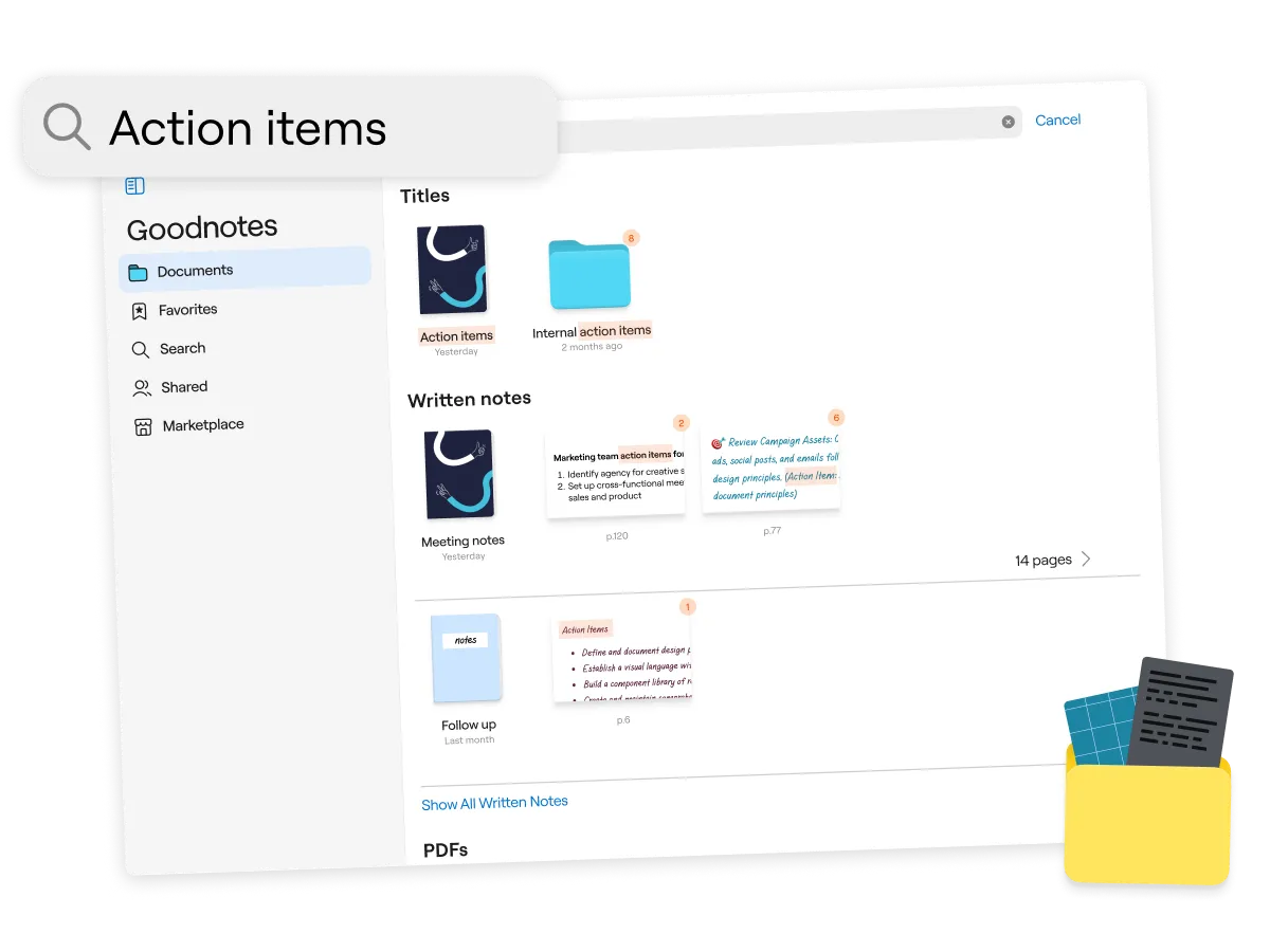 Die Suche von Goodnotes versteht Inhalte und Kontext – so findest du schnell bestimmte Notizen, Ideen oder Details, selbst in handschriftlichen Notizen, PDFs oder Bildern.