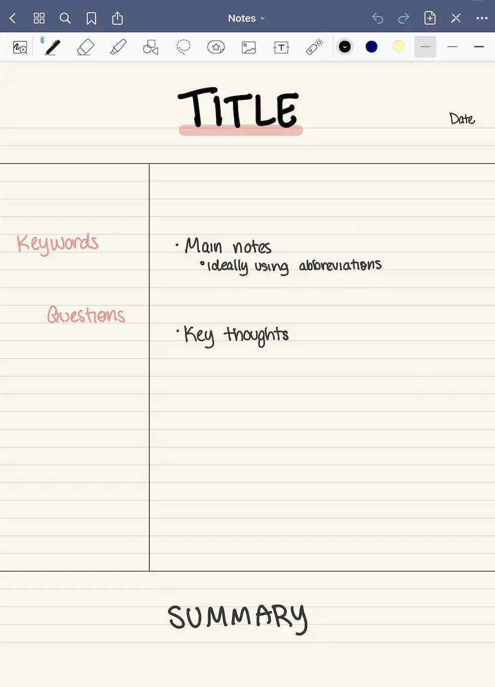코넬 노트를 작성하는 것은 간단합니다. 강의 내용을 적은 모든 실제 노트를 메인 노트 필기 열에 배치하면 됩니다.