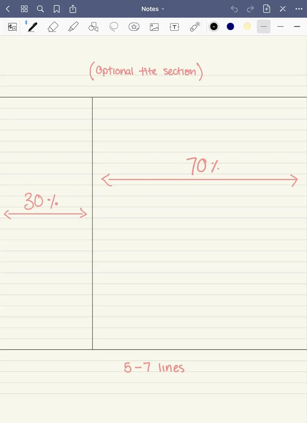 준비할 것이 거의 없기 때문에 수업 시간 필기 시 활용하기 좋은 방법입니다. 페이지를 4개, 때로는 3개의 섹션으로 나눕니다.