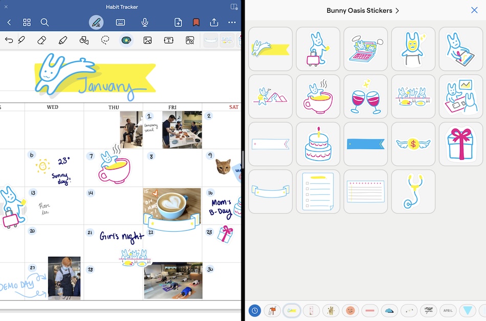 홍콩의 일러스트레이터 Winnie Choi가 그린 이 Bunny Oasis 스티커는 2023년 초 토끼의 해를 기념하고자 Goodnotes 마켓플레이스에서 출시되었습니다.