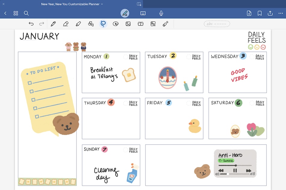 토스트, 러버덕, 사랑스러운 테디 베어처럼 귀여운 스티커와 메모, 목록, 마스킹 테이프 등의 디지털 문구 스티커가 함께 들어 있습니다.