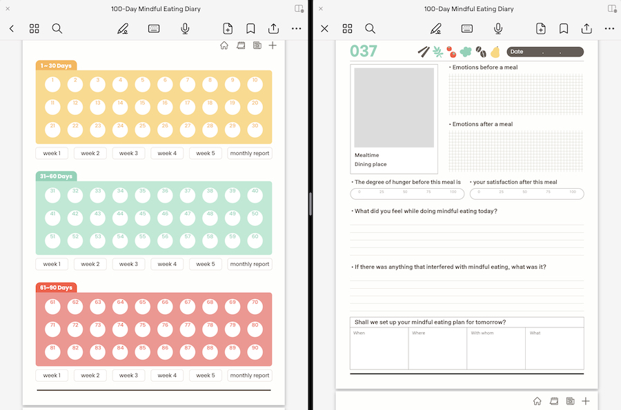 단순한 습관 트래커 '템플릿' 그 이상으로, 건강한 식습관에 초점을 둔 완전한 습관 추적 다이어리라고 할 수 있습니다.