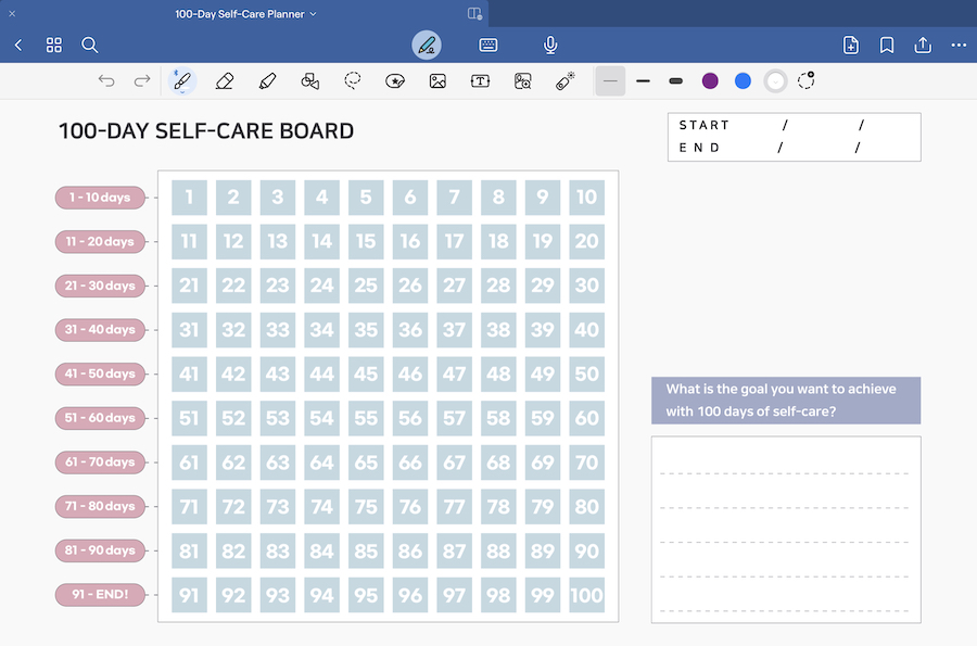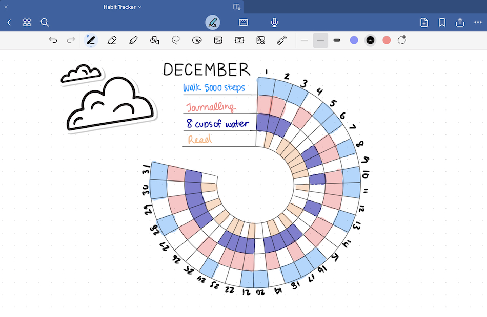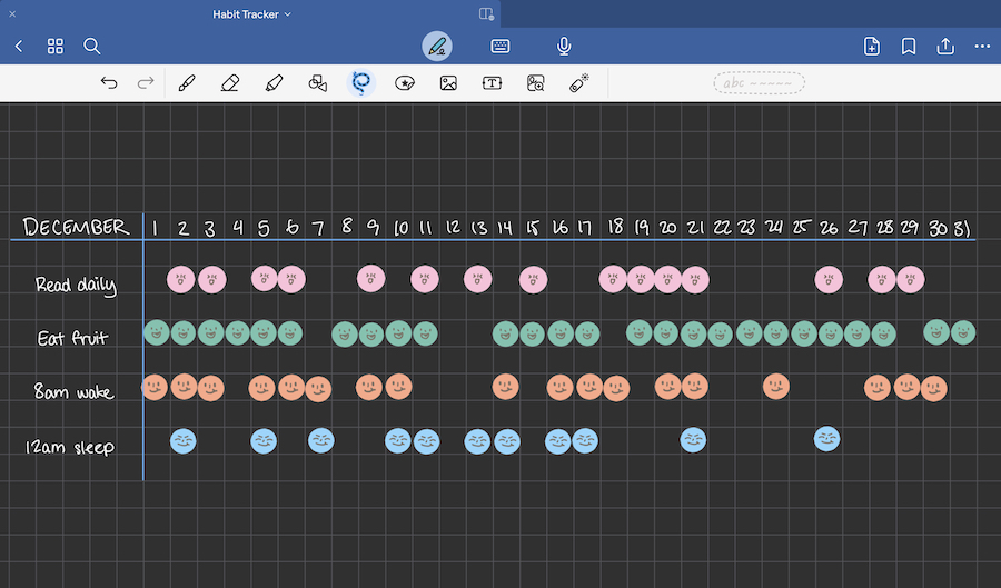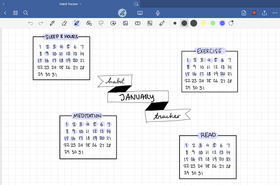 이 템플릿의 경우, 그리드나 그래프용지를 사용하는 것을 추천합니다. 두 축에 날짜와 습관이 표시된 표를 만들기만 하면 됩니다. 사각형을 채워 진행 상황을 추적하세요. 위의 예에서는 디지털 스티커를 사용했지만, 사각형에 색을 칠할 수도 있습니다.