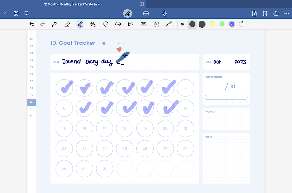 - Goodnotes처럼 즐겨 사용하는 노트 필기 앱에서 다운로드할 수 있는 습관 트래커를 바로 사용해 볼 수 있습니다.